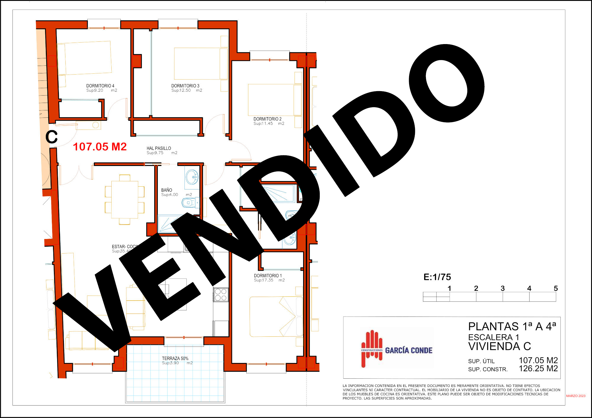 126,25 m2 constr | 107,05 m2 útil | 4 hab | 2 Baños | Cocina comedor | Terraza | Ascensor. Certificación energética A