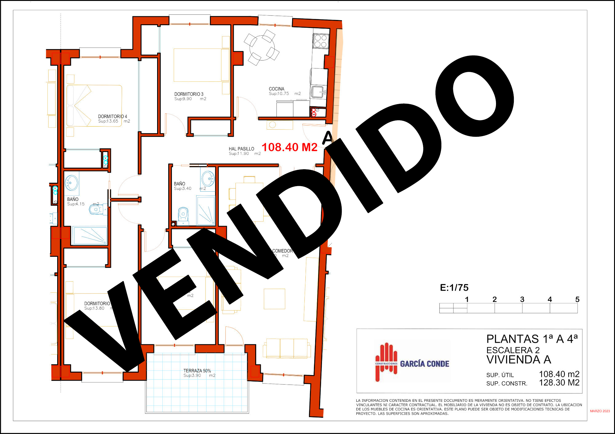 128,30m2 constr | 108,40 m2 útil | 4 hab | 2 Baños | Comedor | Cocina | Terraza | Ascensor. Certificación energética A